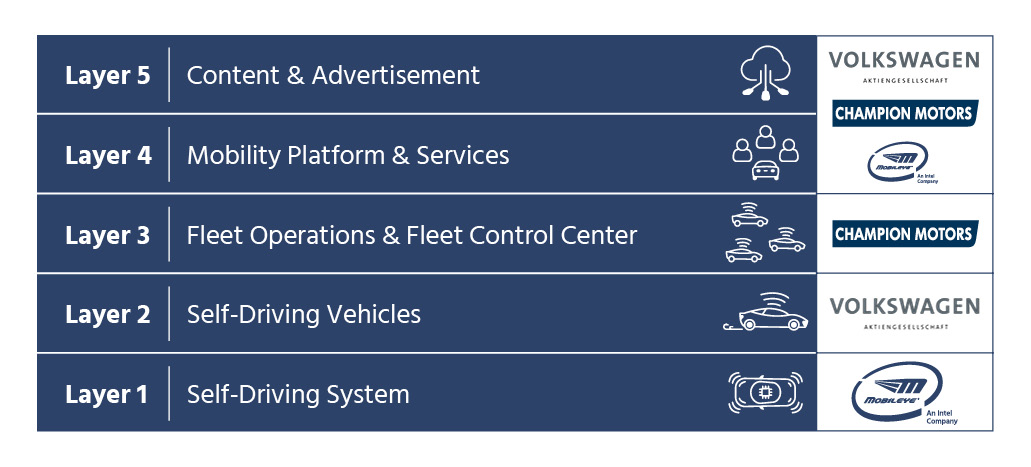 Each of the three companies in the joint venture is providing a piece of this self-driving vehicle business puzzle: Champion Motors will run the fleet operations and control center; VW is going to supply the electric vehicles; and Mobileye is handling the self-driving system. All three companies will add the mobility platform and services to be able to deploy a commercial service.