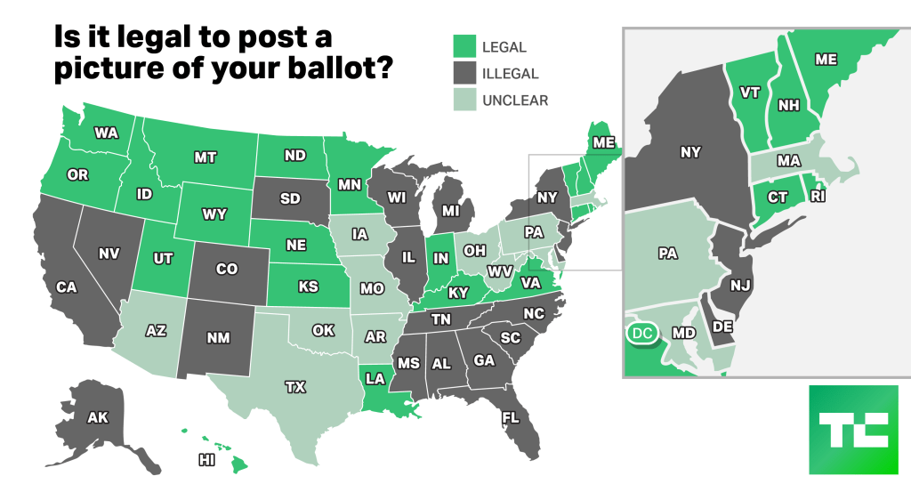 All told, 18 states prohibit the practice, with varying degrees of breadth and severity. It might be a low-level misdemeanor or a more serious offense; it might be a blanket ban on electronics in the polling places; there might be a legal challenge of the law; the state may be vigilant or never care to prosecute… but I’m simplifying them all to “illegal” because one way or another it’s against the law there on this election day.