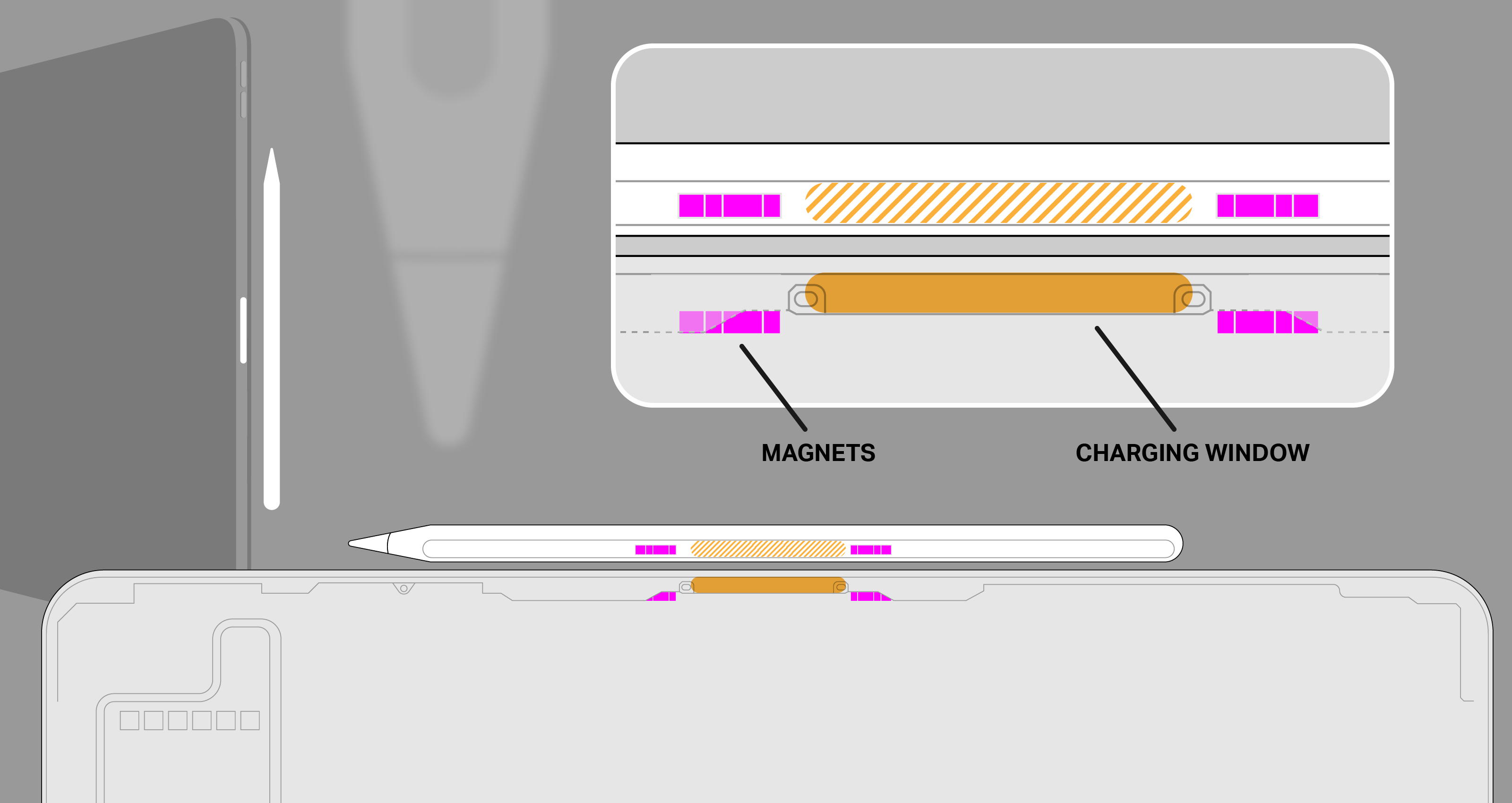 The “top” (for lack of a better term) edge of the iPad Pro in horizontal mode now features a small opaque window. Behind that window are the charging coils for the Pencil. Inside the Pencil itself is a complementary coil, flanked by two arrays of ferrite magnets. These mate with magnetic Halbach arrays inside the chassis of the iPad. Through the use of shaped magnetic fields, Apple pulls a bit of alignment trickery here, forcing the pencil to snap precisely to the point where the charging coils are aligned perfectly. This enables you to slap the pencil on top quickly, not even thinking about alignment.