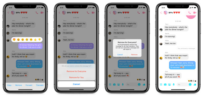 Facebook secretly retracted messages sent by CEO Mark Zuckerberg, TechCrunch reported seven months ago. Now for the first time, Facebook Messenger users will get the power to unsend too so they can remove their sent messages from the recipient’s inbox. Messages can only be unsent for the first 10 minutes after they’re delivered so that you can correct a mistake or remove something you accidentally pushed, but you won’t be able to edit ancient history. Formally known as “Remove for Everyone,” the button also leaves a “tombstone” indicating a message was retracted. And to prevent bullies from using the feature to cover their tracks, Facebook will retain unsent messages for a short period of time so if they’re reported, it can review them for policy violations.