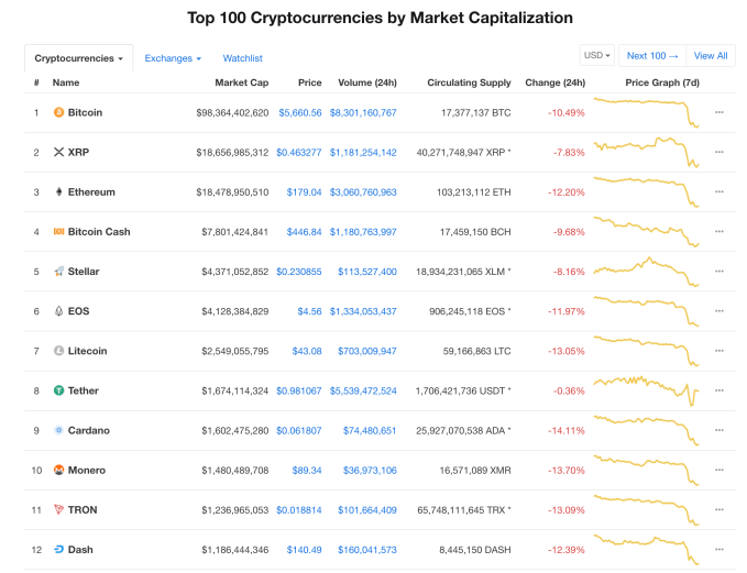 The dip follows a decline that took Bitcoin’s price below the mark $6,000 for the first time this year — it has since plunged below $5,600. That, in turn, caused havoc in the altcoin market with valuations plummeting double-digit percentages nearly across nearly all of the top 100 valued tokens. Of the top ten, Cardano is down 14 percent, Litecoin 13 percent and Ethereum and EOS 12 percent. The changing prices also saw Ripple’s XRP token rise above Ethereum to become the second most valued cryptocurrency behind only Bitcoin.