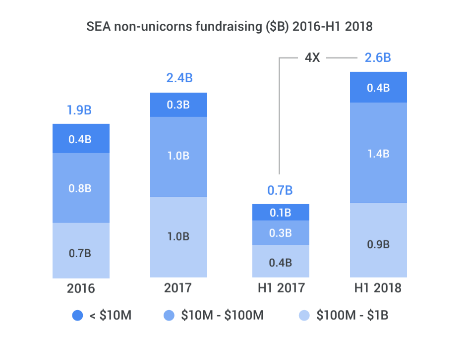 Every edition of the report has stressed that the growth forecasts are contingent on requisite levels of funding, boosting the Southeast Asian startup ecosystem as a whole, so the fact that most capital is going to a few very big players is a concern. However, the report does show there has been progress from the rest of the field, with non-unicorn funding in the first half of 2018 reaching more than the total for the whole of 2017.