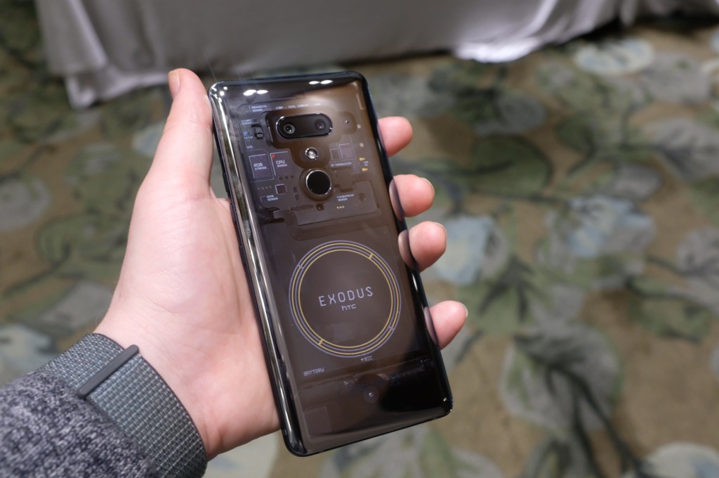As such, the company is using the device as the conduit for a sort of beta testing among the sort of crypto enthusiasts who might pay the Bitcoin/Ether equivalent of $700-900, sight unseen. For that reason, HTC hasn’t done too much to tweak the hardware, beyond some chip-level adjustments like the addition of a secure enclave on the Snapdragon chip. The single major aesthetic update here is the addition of an Exodus HTC logo etched onto the transparent backing (which is highly reflective, hence the somewhat awkward angles here).