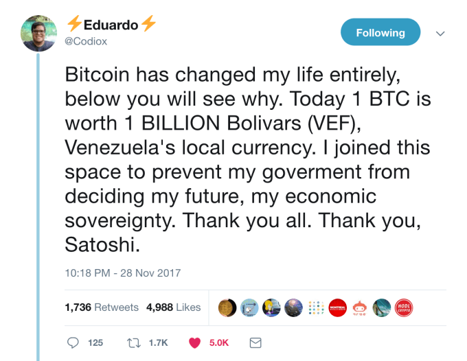 Eventually he would be hired by a company that allows people to purchase things on Amazon using Bitcoin. When Venezuela became unlivable, Eduardo’s company helped him and his support team relocate to Argentina. In a moment of euphoria, Eduardo wrote: