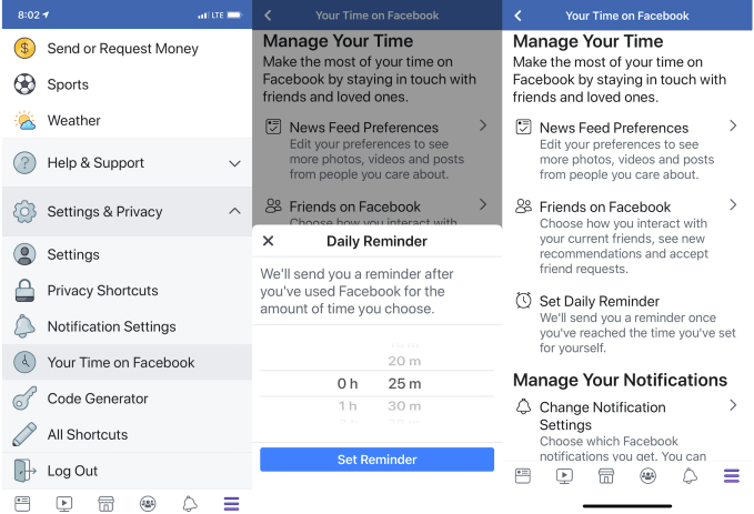 You can set a daily limit and receive a reminder to stop after that many minutes each day, plus access shortcuts to notification, News Feed and Friend Request settings. Those last two shortcuts are new, but otherwise the feature works the same as when it was previewed. You can access it by going to Facebook’s More tab -> Settings & Privacy -> Your Time on Facebook.