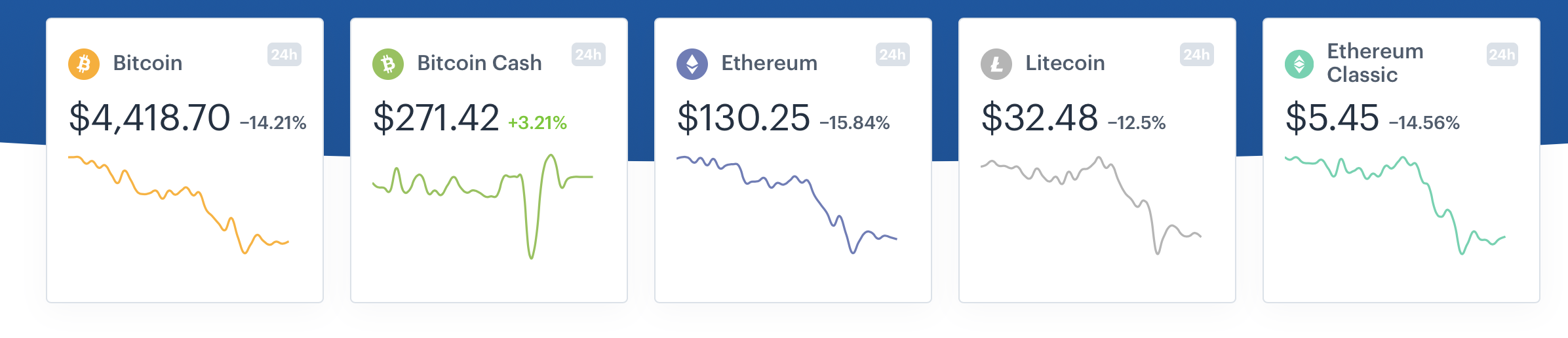 Four days ago the crypto markets were crashing hard. Now they’re crashing harder. Bitcoin, which hasn’t fallen past $6,000 for months, has dumped to $4,413.99 as of this morning, and nearly everything else is falling in unison. Ethereum, flying high at $700 a few months ago, is at $140. Coinbase, that bastion of crypto stability, is currently sporting a series of charts that look like Aspen black-diamond ski runs.