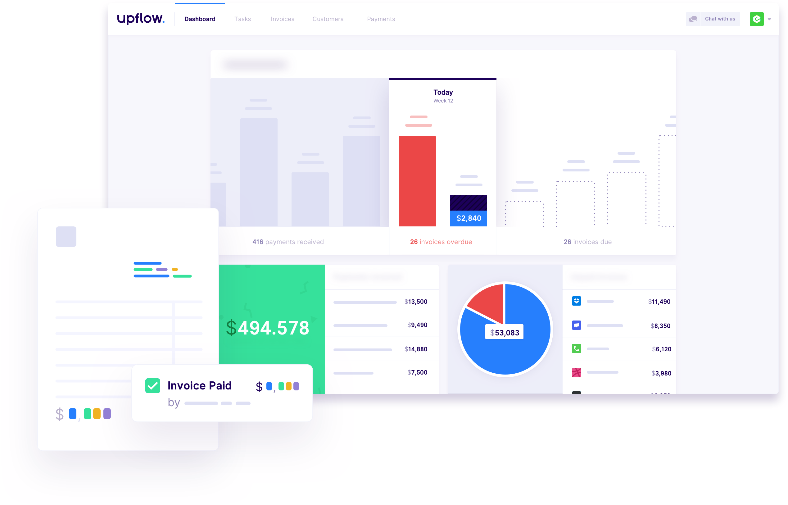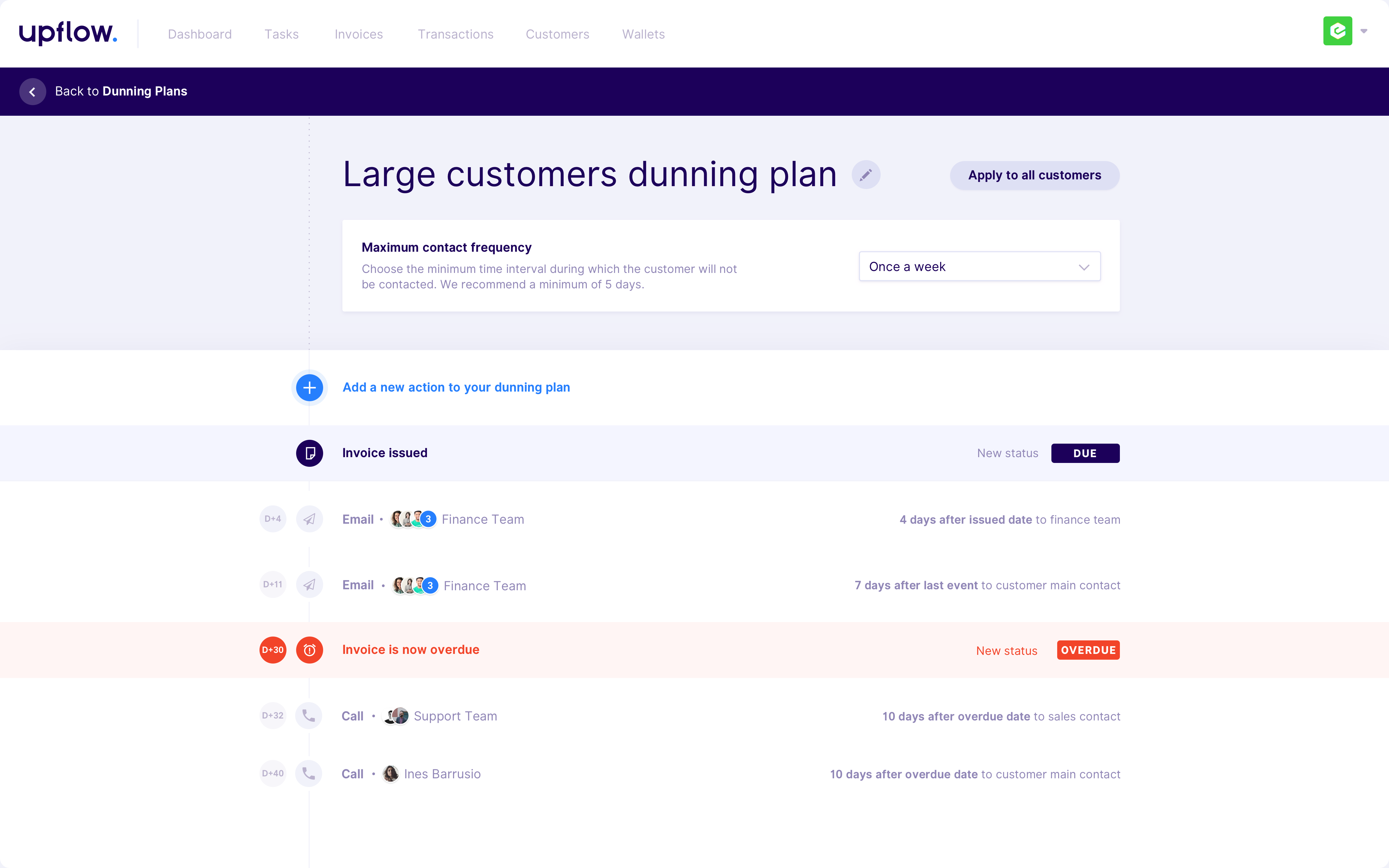 You can view all your outstanding invoices in Upflow’s interface to see where you stand. The service gives you a list of actionable tasks to get your money. For instance, Upflow tells you if you have overdue payments and tells you to contact your client again.
