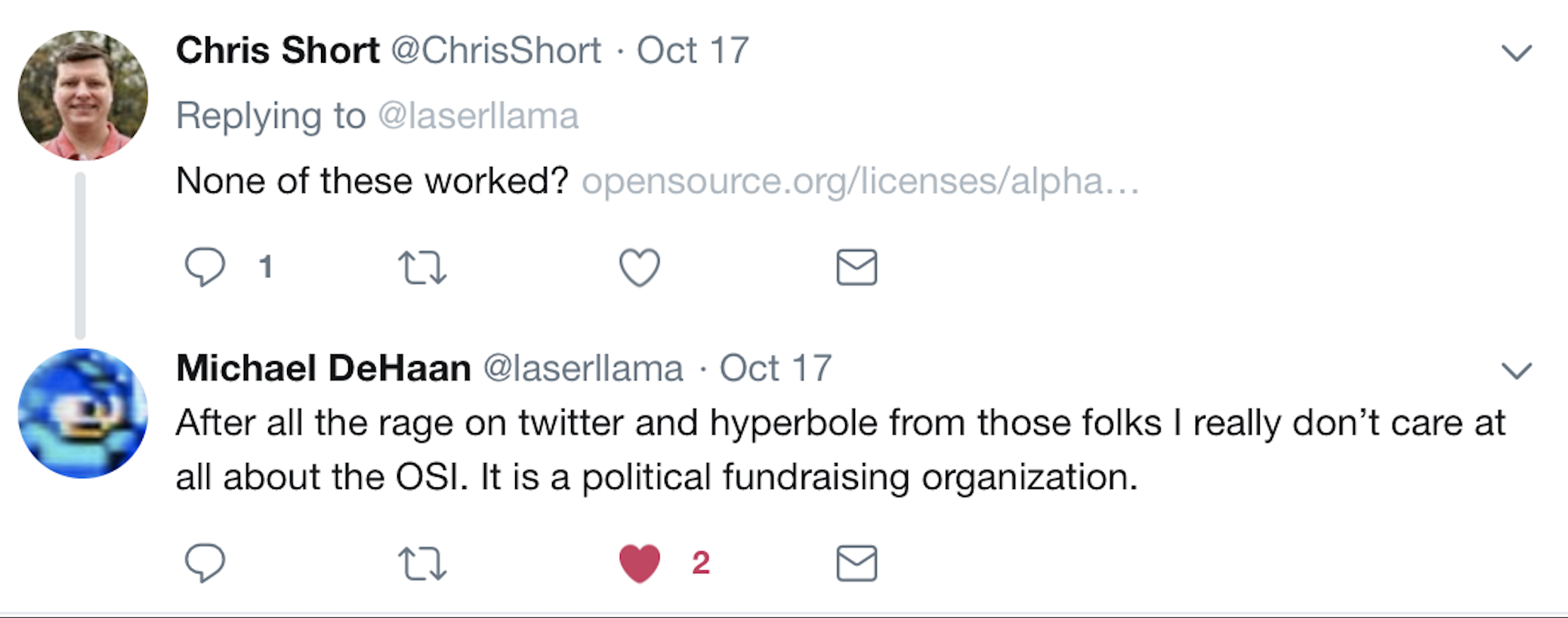 The public archives of OSI’s debate over SSPL are at times informative and at times amusing, bordering on comical. After MongoDB’s original submission, there were rah-rah rally cries amongst the members to find reasons to deem SSPL not an open-source license, followed by some +1’s. Member John Cowan reminded the group that just because OSI does not endorse a license as open source, does not mean that it is not open source: