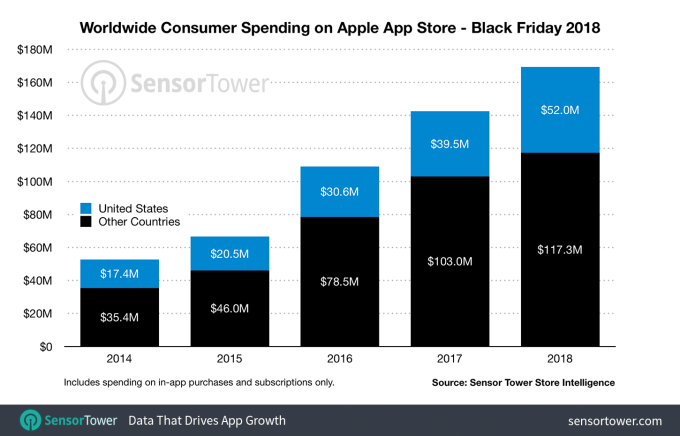 The firm found that $117.3 million was spent by App Store users outside the United States on Black Friday, bringing the global total to $169.3 million, up 18.4 percent from 2017. The spending outside the U.S. was up 13.9 percent year-over-year, but that’s lower than the U.S.’s year-over-year growth of 31.6 percent between Black Friday 2017 and Black Friday 2018.