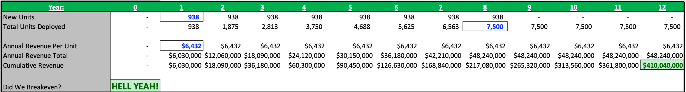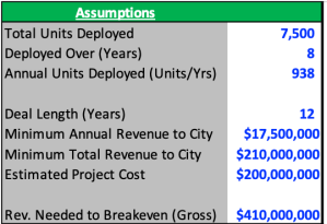 Let’s start with the cost side; based on an estimated project cost of around $200 million for at least 7,500 Links, we can get to an estimated cost per unit of $25,000 – $30,000. It’s important to note that this only accounts for the install costs, as we don’t have data around the other cost buckets that the developers would also be on the hook for, such as maintenance, utility and financing costs.