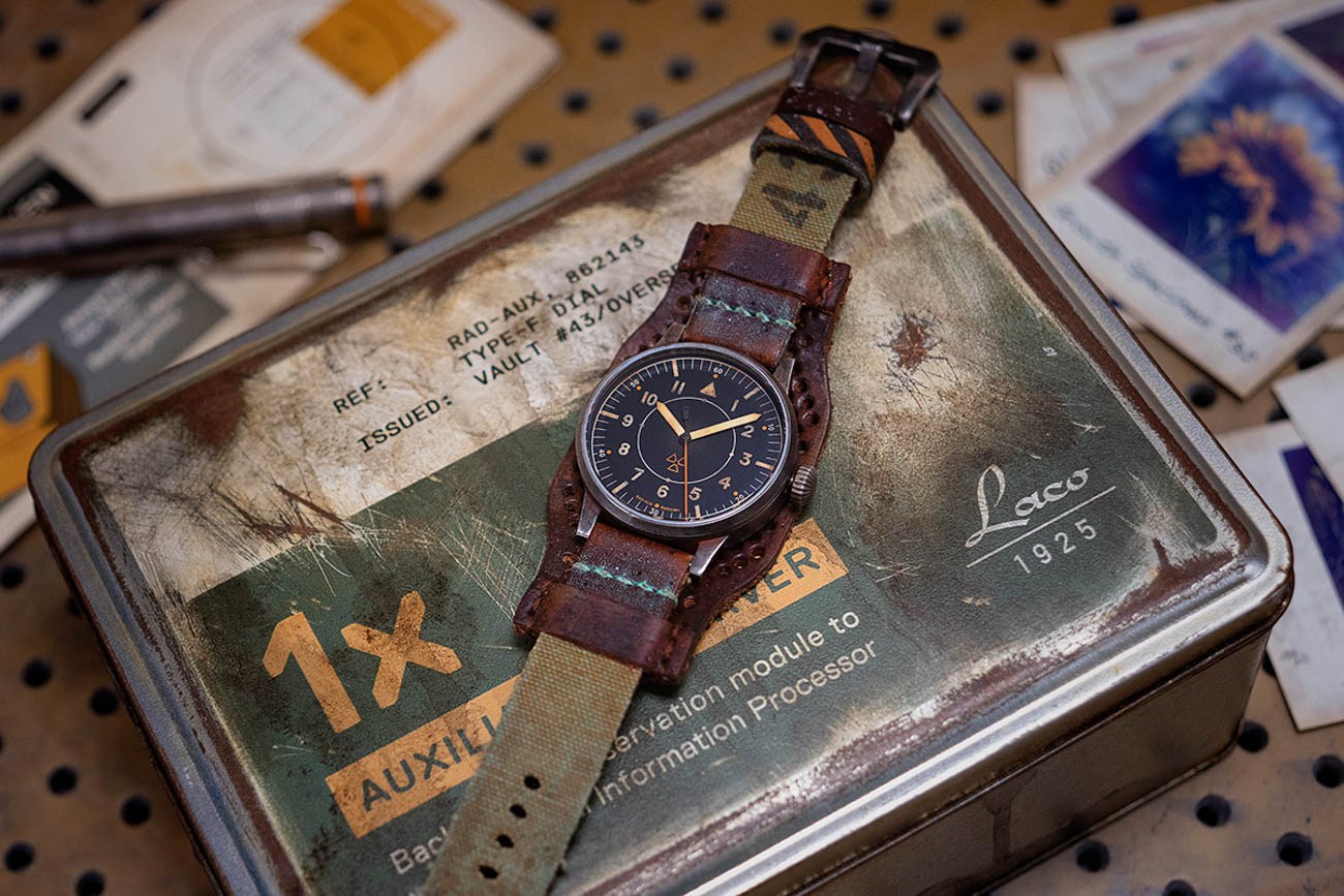 Laco is a small German watch company famous for its Flieger watches — pieces featuring big crowns and legible faces designed for pilots. Now the brand has teamed up with A Blog To Watch on a Fallout-themed watch that looks like something pulled out of a deserted vault.