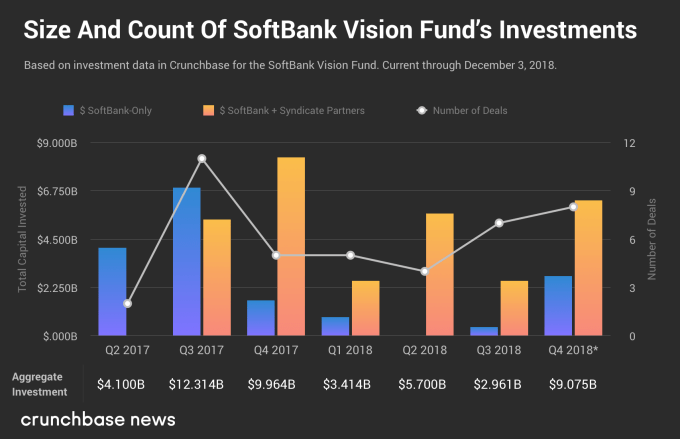 So far in 2018 the SoftBank Vision Fund has invested in more than 20 deals, accounting for over $21 billion in total investment. That sum didn’t all come from the Vision Fund of course — SoftBank’s Vision Fund typically invests alongside one or more syndicate partners who help fill out bigger rounds — but the amounts are nonetheless staggering. The chart below shows the Vision Fund’s investments since its inception in 2017.