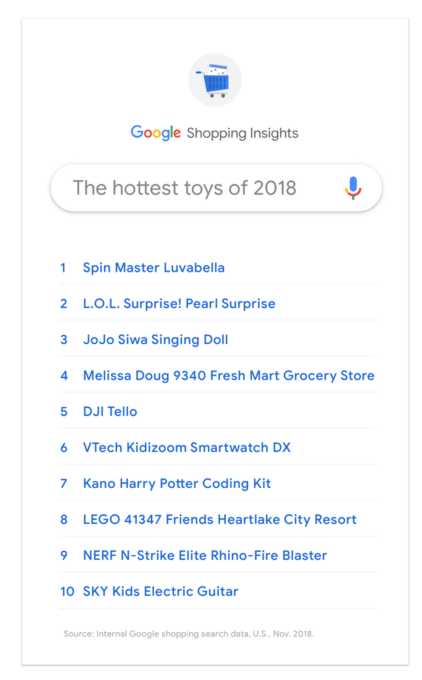 The toy maker has not one but three of its L.O.L. Surprise! toys on Google’s list this year, which the search giant points out were also all the subject of numerous YouTube unboxing videos over the holiday shopping season, which helped drive searches. The most searched for toy — Spin Master’s Luvabella doll — was also regularly featured across YouTube, the company notes.