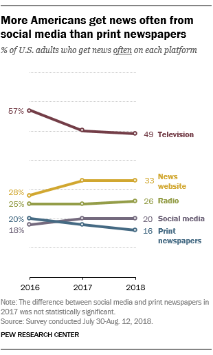 Last year, the portion of those who got their news from social media was around equal to those who got their news from print newspapers, Pew says. But in its more recent survey conducted from July 30 through August 12, 2018, that had changed.