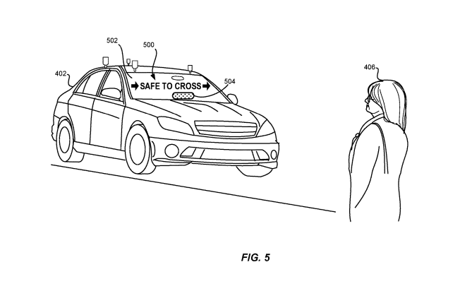 “[…] integrating these autonomously-provided services into a mixed autonomous and human-operated environment has many challenges,” the patent filing states. “Drivers and pedestrians are accustomed to interacting in particular ways, removing a driver from some vehicles can lead to uncertainty and miscommunication.”