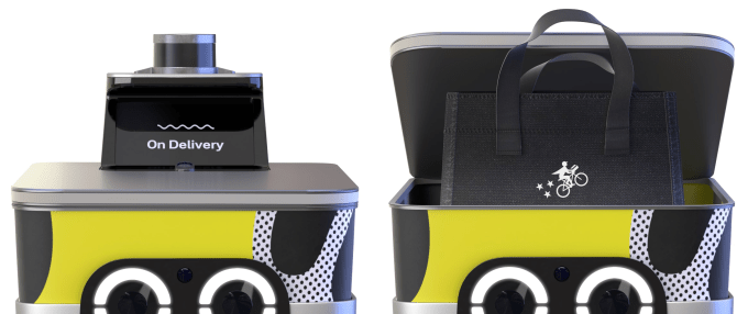 Serve can carry 50 pounds of goods for 25 miles on a single charge — enough to make around a dozen deliveries per day. Thanks to a low center of gravity achieved by building the battery into the bottom of the chassis, it’s less likely to get cow-tipped. It uses Velodyne Lidar and a NVIDIA XAVIER processor to tell where it’s going. A Postmates spokesperson tells me, of the scalability and efficiency of the rovers, that “ultimately we believe that there will be a world where goods move rapidly at almost zero cost to the consumer.”