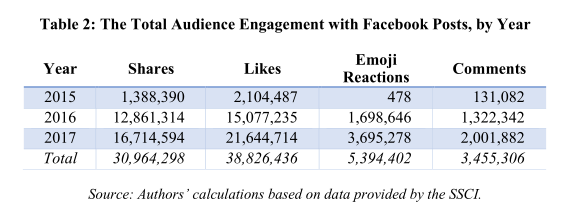 The Oxford researchers better quantify the engagement, on Facebook first, with more specific and consequential numbers. For instance, in 2016 and 2017, nearly 30 million people on Facebook actually shared Russian propaganda content, with similar numbers of likes garnered, and millions of comments generated.