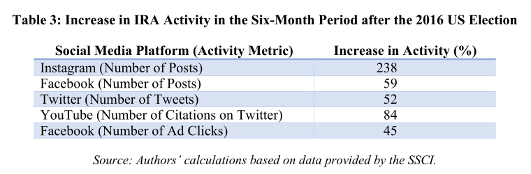 IRA-related Instagram posts jumped from an average of 2,611 per month in 2016 to 5,956 in 2017; note that the numbers don’t match the above table exactly because the time periods differ slightly.