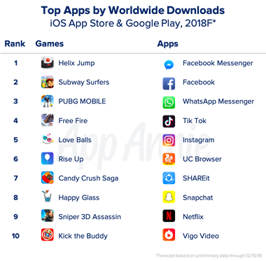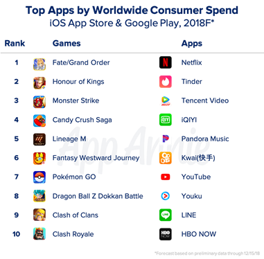 The firm released the Top Charts across both app stores for 2018, with Messenger receiving the most downloads out of all apps, excluding games, and Helix Jump being the most downloaded game. Fate/Grand Order generated the most revenue out of all games, while Netflix generated the most out of non-games.