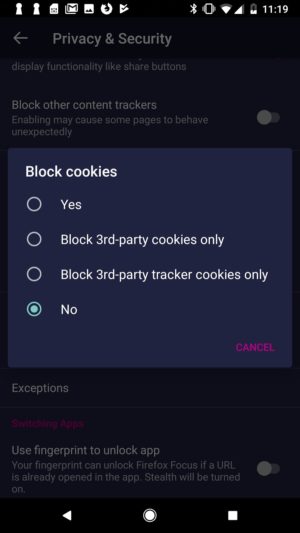 The main new addition here is support for Enhanced Tracking Protection. This feature first launched in Firefox for the desktop. It allows you to block cookies and trackers with a bit more granularity than was previously possible. Until now, Focus blocked all cookies by default. Now, however, you can choose to either continue doing that — but with the risk of sites breaking every now and then — or opt to allow third-party cookies or only third-party tracking cookies. Mozilla uses Disconnect’s Tracking Protection list to power this feature.