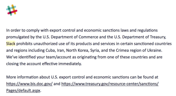A number of Slack users report that they have suddenly lost access to their accounts with no warning in what appears to be an aggressive implementation of U.S. sanctions on Iran.