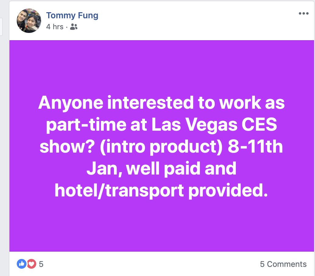 Maybe you’re going to buy a booth. I wouldn’t, but go ahead and give it a try. I like what my friend Tommy here did. Instead of going through one of the countless staffing agencies in Las Vegas he put out a general call for help and he got plenty of responses. Lots of people would be willing to go to Las Vegas to help out for not much cash.