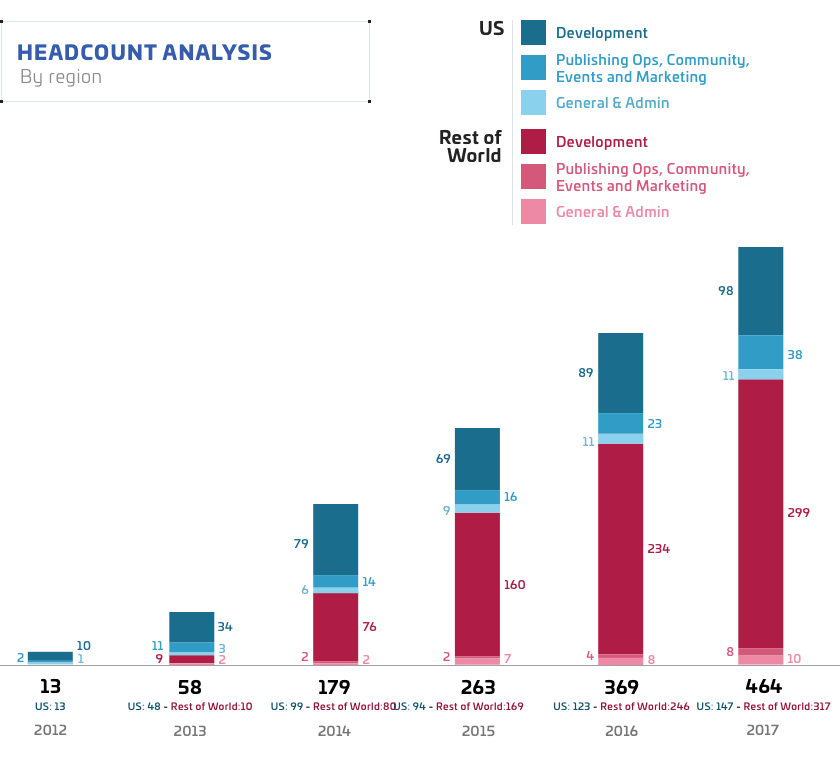 The company has grown steadily, adding a hundred people a year or so to a present size of 464 — which is the kind of size you’d expect on a AAA game like Assassin’s Creed or Red Dead Redemption. Even more would be added on as temporary artists, actors and so on.