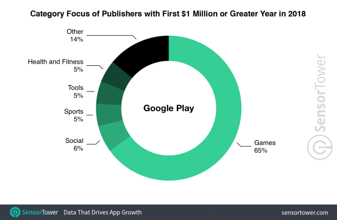 On Google Play, the majority (65 percent) of new million-dollar publishers were games, compared with just 33 percent on the iOS App Store. The social category, at 6 percent, trailed in second place.