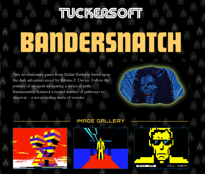 On the regular Tuckersoft site, discovered through a QR code embedded in the show itself, Tuckersoft advertises its game lineup including Bandersnatch, a “revolutionary game from Stefan Butler.” In this timeline, Tuckersoft released both Nohzdyve and Bandersnatch, and Stefan eventually eclipsed his gaming idol Colin’s own fame, driving the company forward. As the site notes: