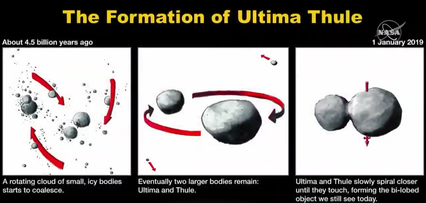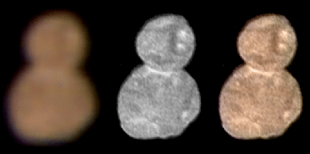 It’s formed of two lobes, the larger and smaller of which are named Ultima and Thule respectively, which likely accreted individually in the earliest days of the solar system, then entered each other’s influence and eventually encountered one another, fusing.