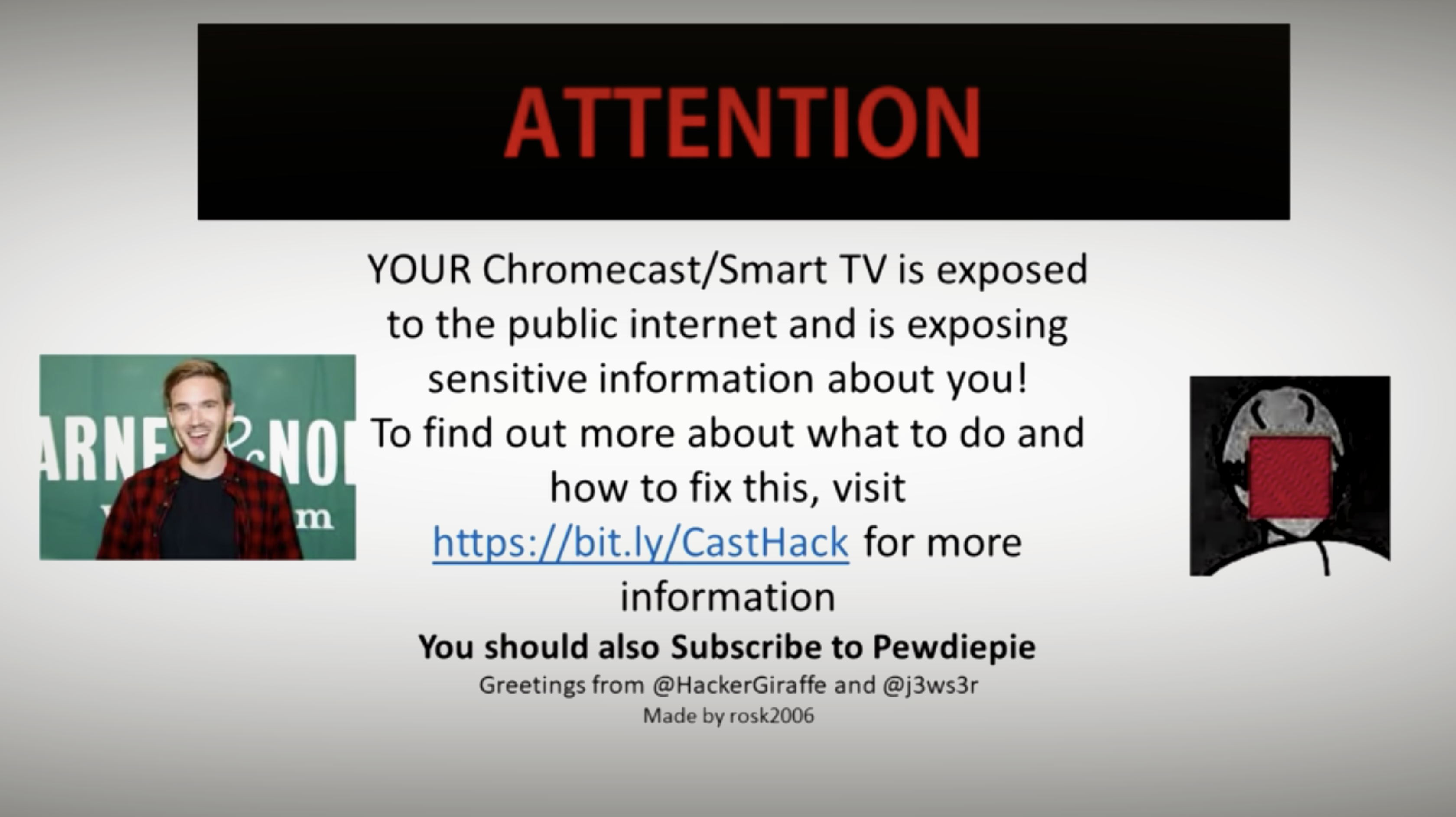 The culprits, known as Hacker Giraffe and J3ws3r, have become the latest person to figure out how to trick Google’s media streamer into playing any YouTube video they want — including videos that are custom-made. This time around, the hackers hijacked forced the affected Chromecasts to display a pop-up notice that’s viewable on the connected TV, warning the user that their misconfigured router is exposing their Chromecast and smart TV to hackers like themselves.