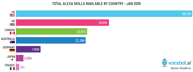 In the U.K., the number of Alexa skills rose 233 percent this year to reach 29,910 by year end. In Germany, the skill count grew by 152 percent to reach 7,869 skills. Canada had 22,873 skills as of the beginning of January 2019; Australia has 22,398; Japan has 2,364; and France has 981. (Voicebot says it hasn’t yet set up a system for counting the skills in India, Spain, Mexico or Italy at this time.)