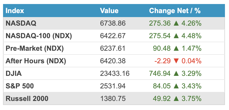 That news, coupled with a strong jobs report, sent stocks rocketing up. The Dow Jones Industrial Average climbed 746.9 points, or roughly 3.3 percent, while the Nasdaq shot up 4.3 percent, or 275.4 points.