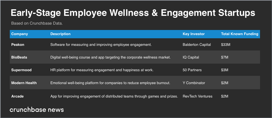 In the chart below, we look at a few of the companies that received early-stage funding this year to build out software platforms and services aimed at making people happier and more effective at work: