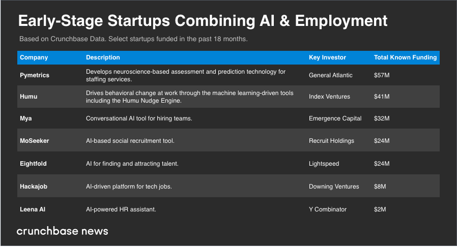 In 2018, at least 43 companies applying AI or machine learning to some facet of employment have raised seed or early-stage funding, according to Crunchbase data. In the chart below, we look at a few startups that have secured rounds, along with their backers and respective business models: