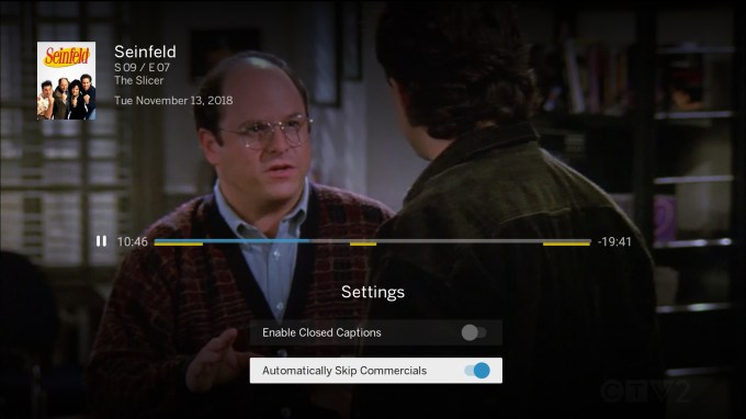 Still, the feature is notable because it’s automatic – you don’t have to worry with fast-forwarding or even pressing a commercial skip button, as on TiVo. It also works across all timeslots and shows, for the most part – not only those airing during primetime.