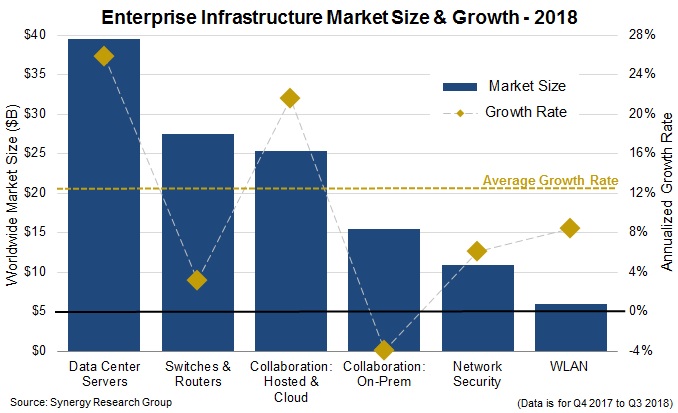 In fact, Synergy reported that overall spending in enterprise infrastructure, which includes elements like servers, switches and routers and network security; grew 13 percent last year and represents a $125 billion business — not too shabby for a market that is supposedly on its deathbed.