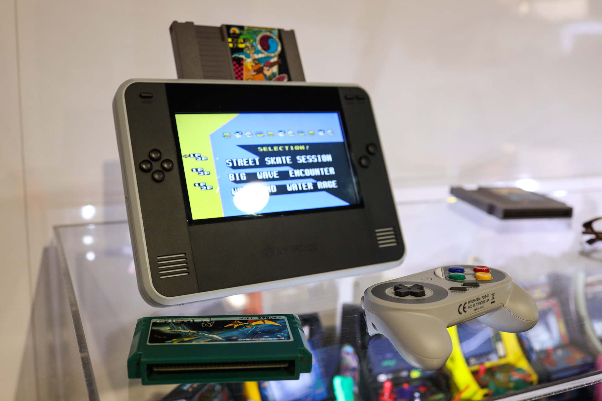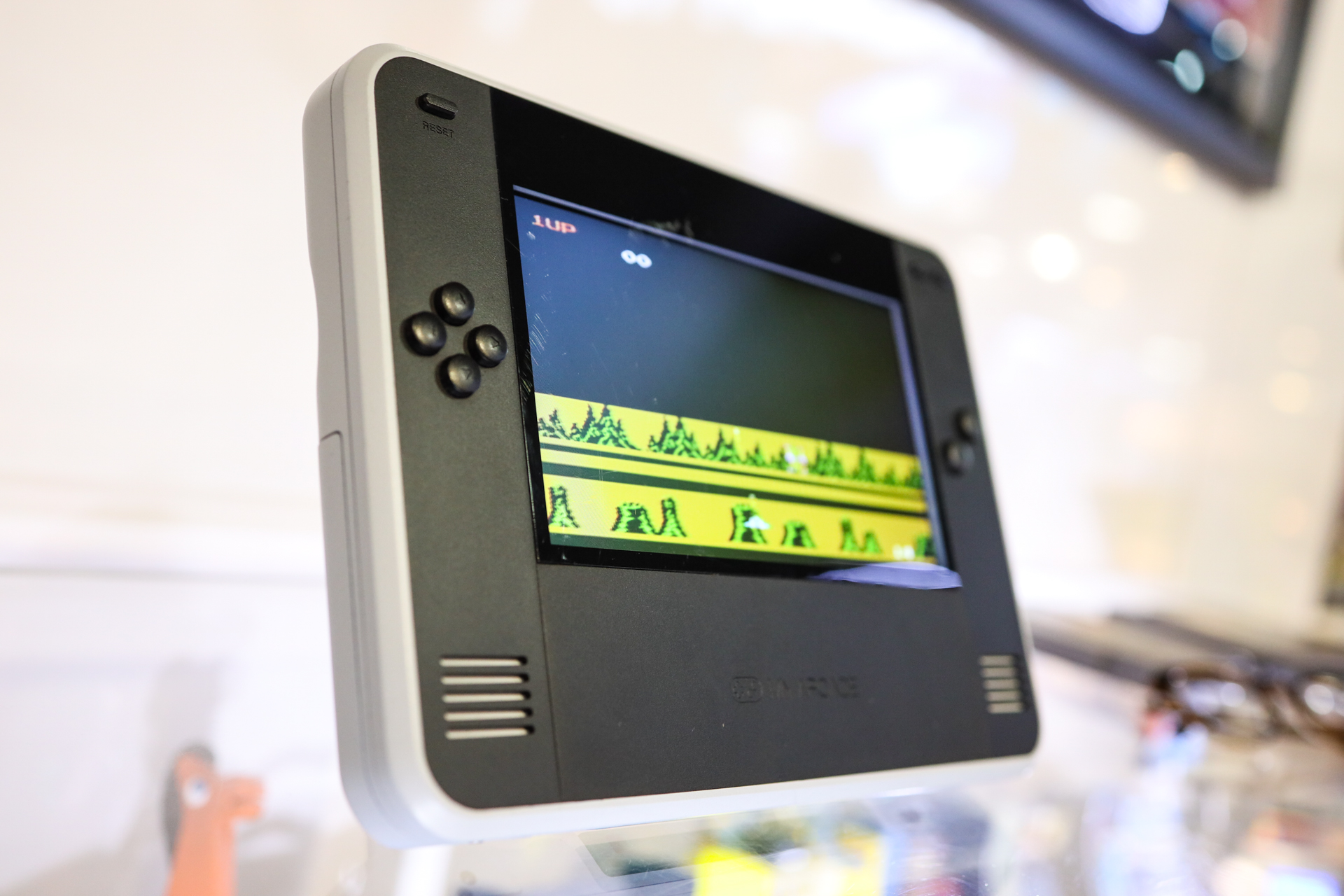 The 7-inch screen is bright and the color looked good; it was responsive and the device felt well-balanced. The controls are where you’d expect, with big scoops in the back of the case to help you grip it. NES cartridges go in the top (and stick out as you see) and Famicom cartridges tuck in the bottom.