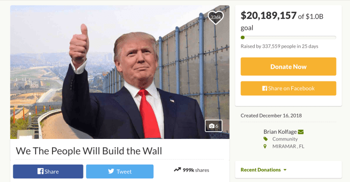 Surprising perhaps no one beyond its donors, the campaign collided with reality, with Kolfage coming to the realization that “the federal government won’t be able to accept our donations anytime soon” given that there is no actual mechanism through which it could do so. On the campaign page, Kolfage newly disclosed his plans to form a nonprofit, “We Build The Wall, Inc.” that would hold onto the donations until the federal government is able to accept them or until all of the donors eventually forget the project altogether.