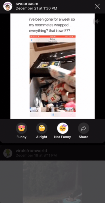 Once users open a Dailies collection or start scrolling the feed, it turns into a black-bordered theater mode that auto-advances after you finish a video clip for lean-back consumption. Facebook cuts each video clip up into sections several seconds long that users can fast-forward through with a tap like they’re watching a long Instagram Story. Below each piece of content is a set of special LOL reaction buttons for “Funny”, “Alright”, and “Not Funny”. There’s also a share button on each piece of content, plus users can upload videos or paste in a URL to submit videos to LOL.