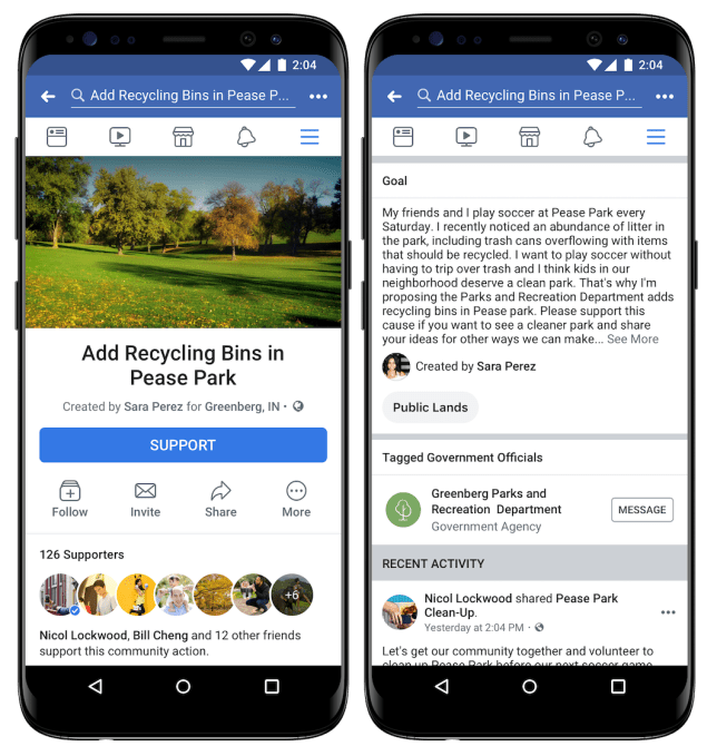 The launch follows other civic-minded Facebook features like its Town Hall and Candidate Info for assessing politicians, Community Help for finding assistance after a disaster, and local news digest Today In. A Facebook spokesperson who gave us the first look at Community Actions provided this statement: