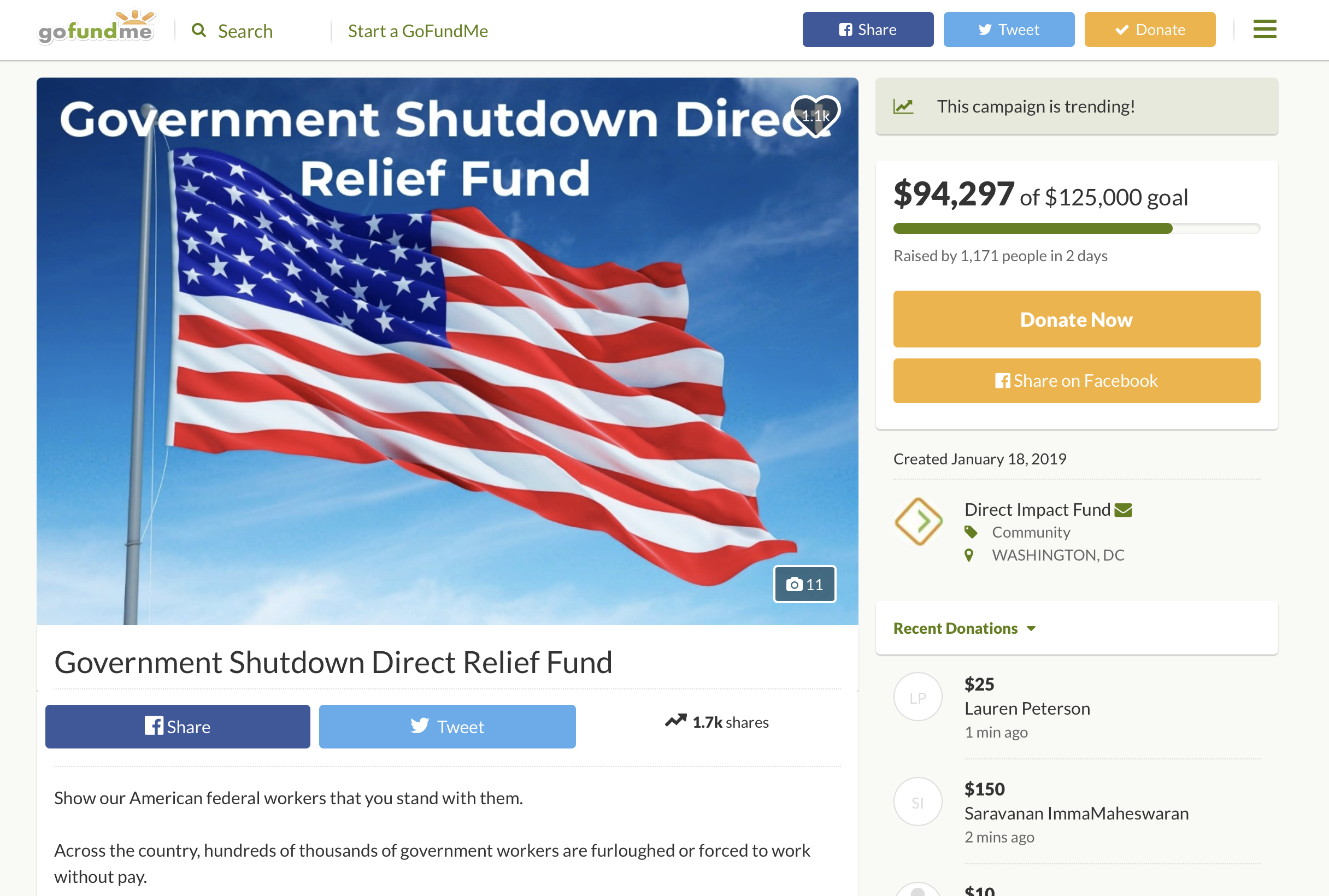 Once again, GoFundMe’s role is unclear. Many individuals use the platform to pay for medical bills and compensate the flaws of the healthcare system in the U.S. This time, a GoFundMe campaign is taking over during a government shutdown. In other words, a private company is managing the budget of government workers, or at least their most essential needs.