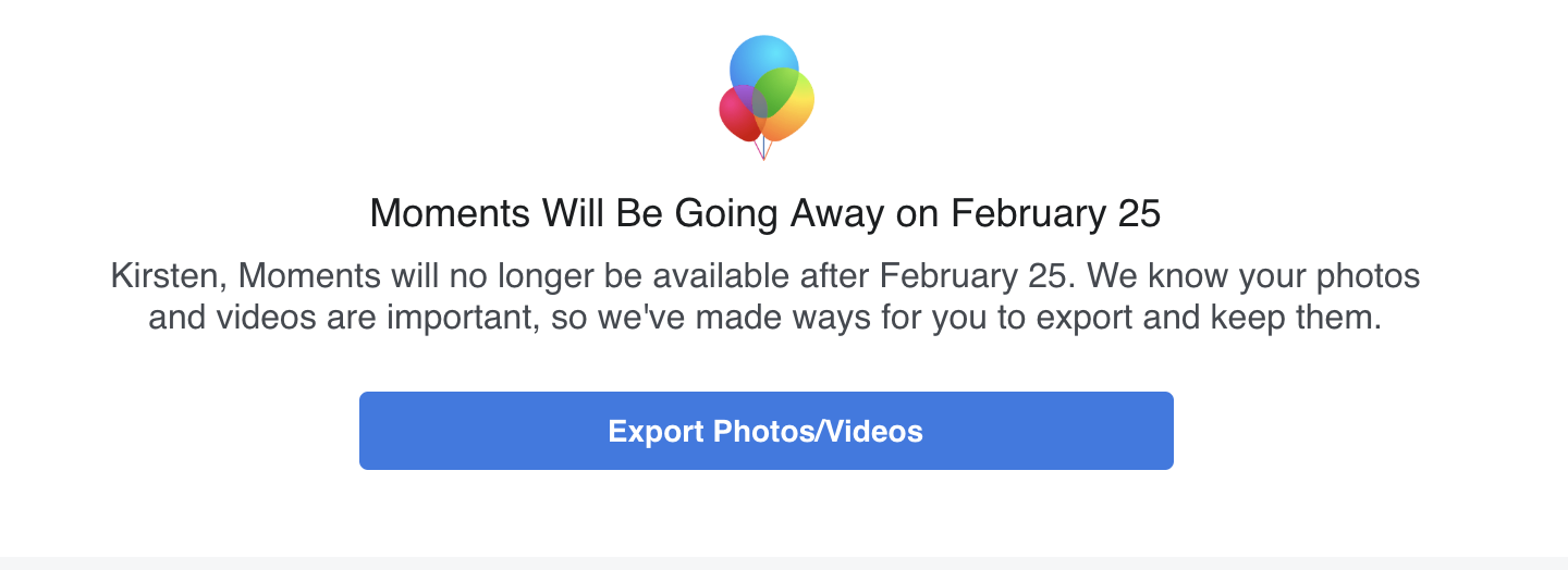 Moments users should see a message warning them of the imminent end of the app. Below the message is an option to export photos and videos.