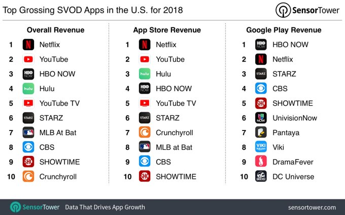 Subscriptions are booming on the app stores, and particularly subscription video apps, thanks to the growing number of cord cutters who are choosing to stream their TV shows and movies instead of paying for cable or satellite. In the U.S., the top 10 subscription video apps by revenue pulled in $1.27 billion in 2018 across both the iOS App Store and Google Play, according to new data from Sensor Tower — that’s a 62 percent increase over the $781 million spent in 2017.