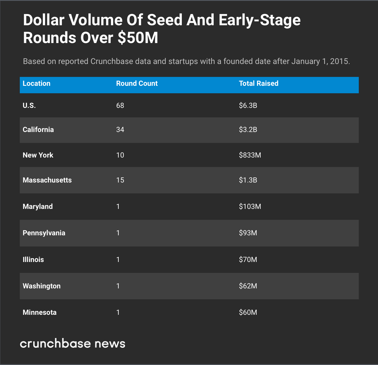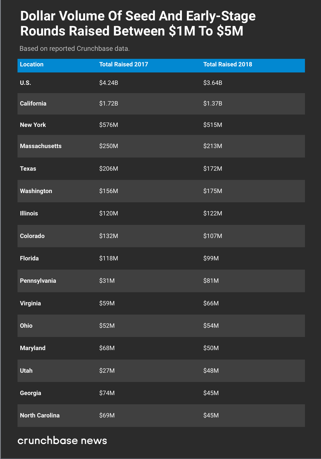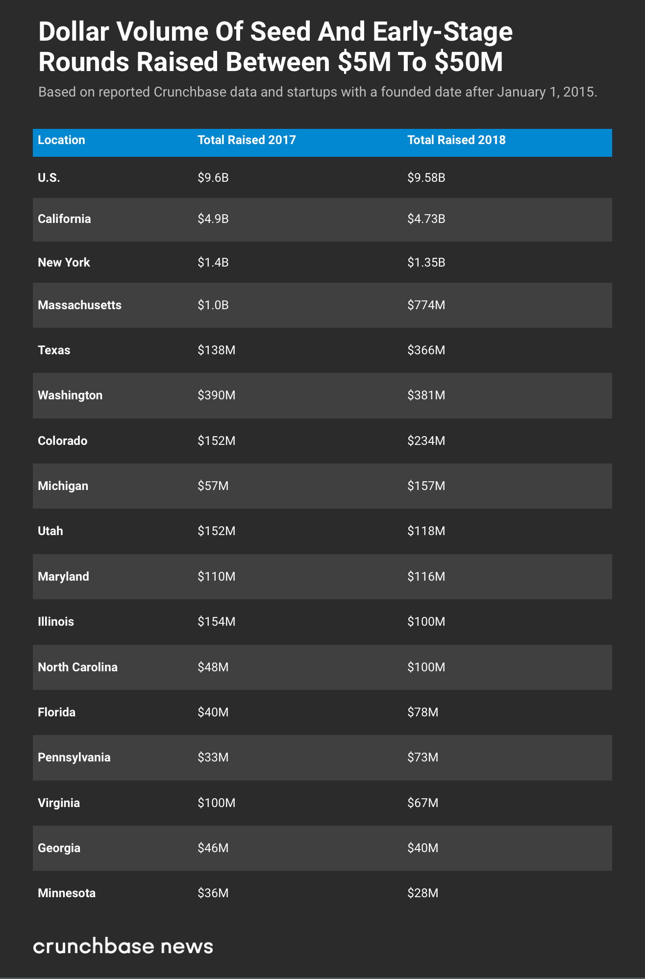 The data indicates that really big early-stage rounds still primarily occur in the biggest startup hubs. The San Francisco Bay Area, New York and Boston were home to more than 85 percent of companies in the 2018 list for the category. No other state brought in more than one deal.