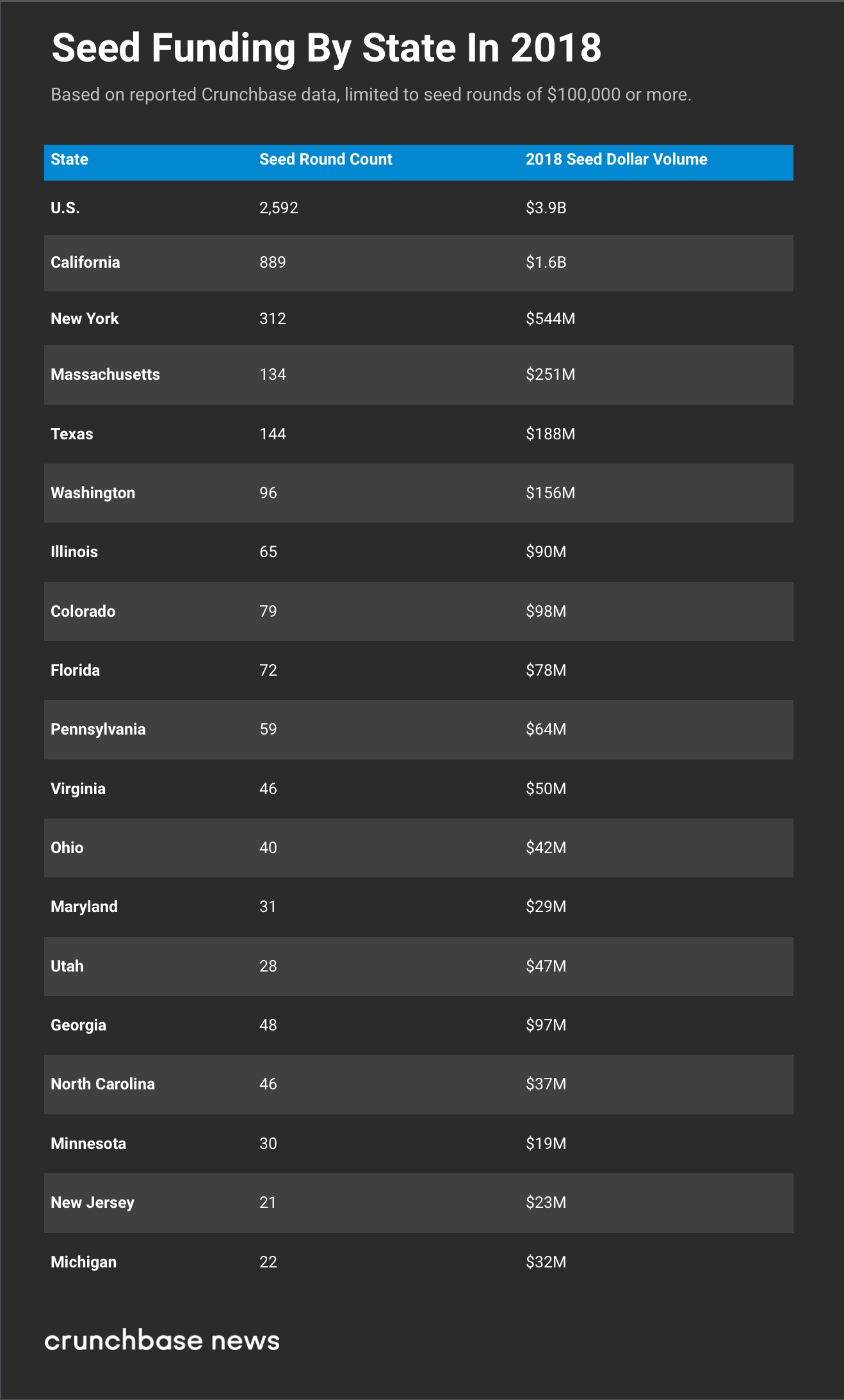 To begin, let’s take a look at the breakdown for seed-stage funding and rounds among the 18 states that account for the overwhelming majority of investments: