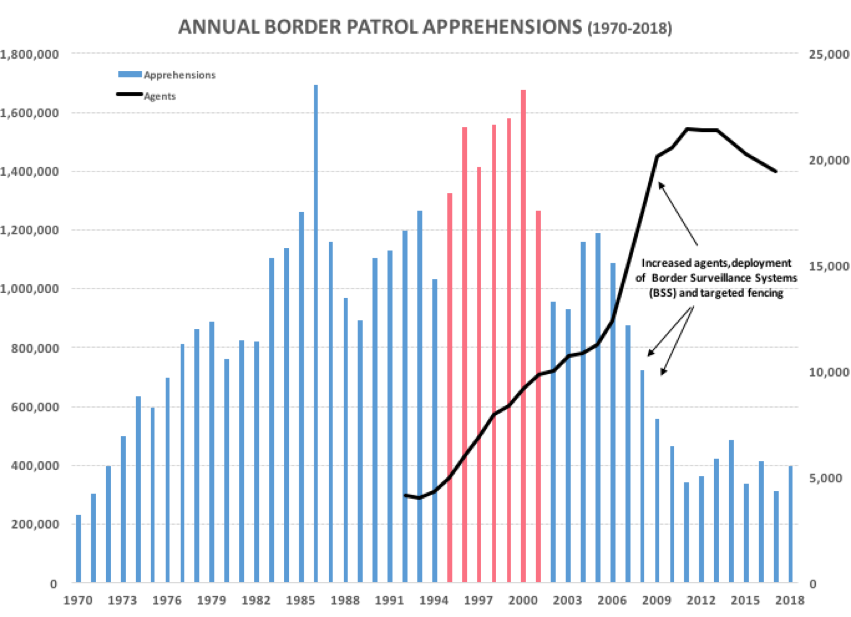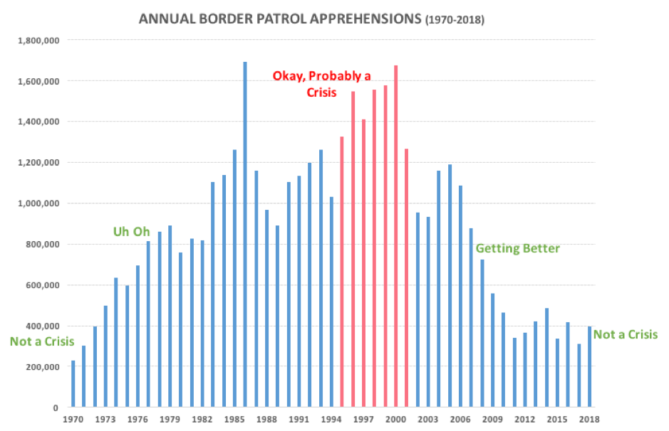 Consequently, we end up left with a situation where we’ve actually done an encouraging about-face on border security from the legitimate crisis of 18+ years ago — yet the repeatedly peddled need is to “build-the-wall.” But building the wall is undoubtedly not a well-reasoned means to some clear end, but rather the end-goal itself, perpetually requiring the salesman to navigate the thin ridge between ignorant and dishonest cliffs.