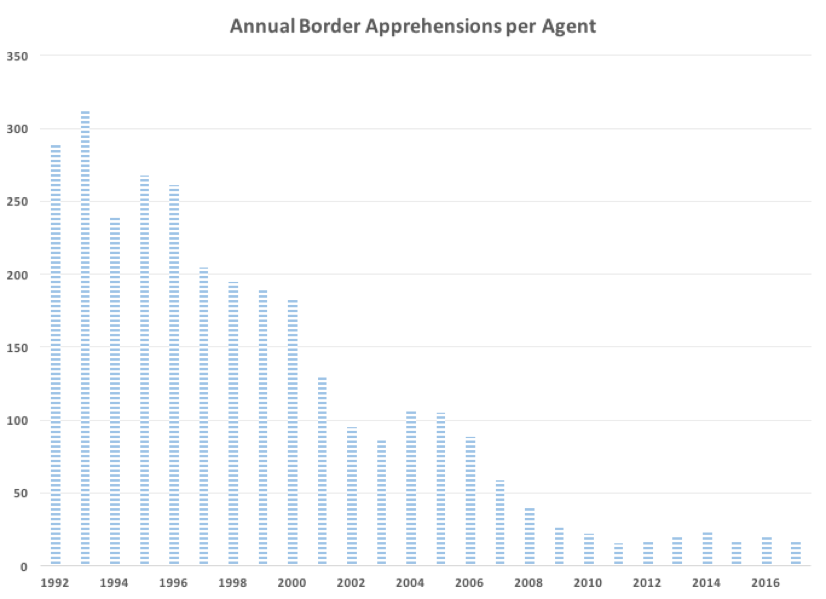 Further validation of this comes when you examine annual apprehensions per Border Patrol agent, per year. If we had just doubled or tripled agents and they were still being overwhelmed at the same rate they were in the 1990s or early 2000s, we might have a true national crisis on our hands. On the contrary, in 1993, Border Patrol agents averaged 313 apprehensions per agent during the year, but in 2017 that figure had plummeted to just 16 border apprehensions per agent — a 95 percent reduction we’ve likely never taken a moment to either recognize, or tie back to the previous border security investments that were made.