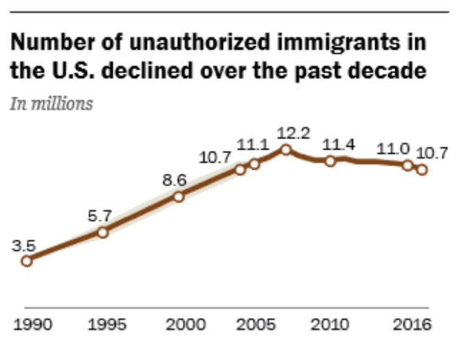 If apprehension data can be taken as a reasonable barometer for illegal immigration activity, and illegal immigration activity has dropped significantly over the last several years, then you might even expect to see a leveling off of the growth of undocumented immigrants already residing within the U.S. The most recent data from Pew Research (generally recognized as the best at tracking this) confirms just that, suggesting that the number of undocumented immigrants in the U.S. not only peaked around 2007, but seems to be in a gradual decline since then, dropping from 12.2 million to 10.7 million. This makes sense given the apprehension data above.