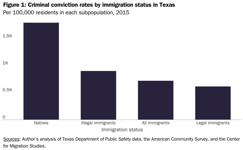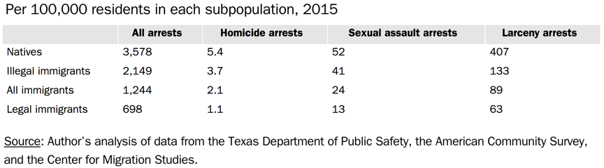 Looking at arrests instead of convictions yields a similar outcome, where total arrests of illegal immigrants for those same crimes were 40 percent lower than those native to the U.S.